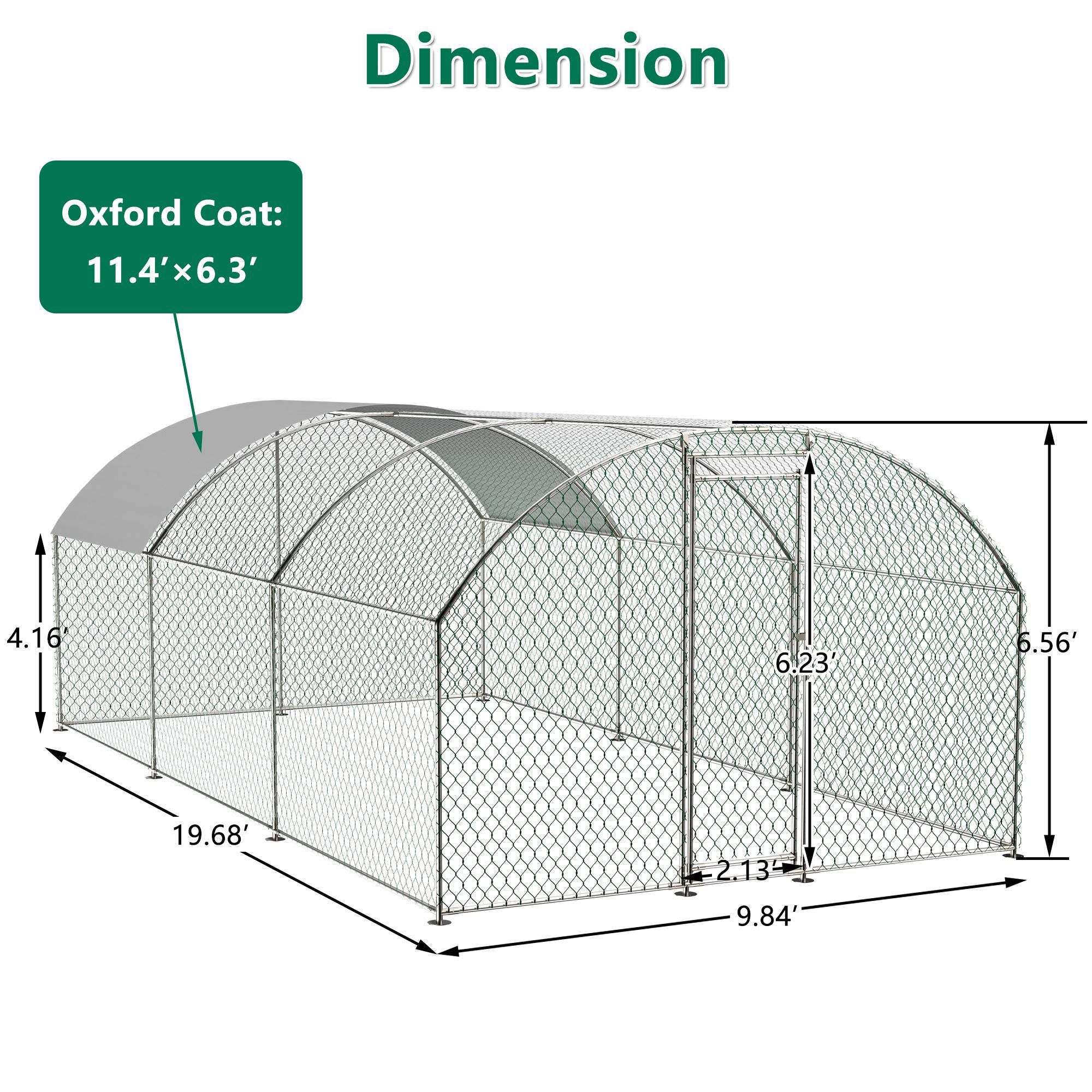 Our chicken run manufactured with high quality steel frame, including ground nails, so that the fence can better fixed to the ground.solid enough to keep the poultry from escaping and secure from predators. And this hen run house is also stably stationed to withstand the wind and snow weather.Featuring a durable sun and rain-proof tarp on the top, it is protective for the steel frame, wire mesh and animals under its cover. And the tarp is sturdy enough to avoid tear up or fade over time.With hexagonal wire mesh and the small gaps between meshes, you can prevent your chicken from some predators to make them safety.The spring clasp design requires no-welding for your quick assembly with this large metal chicken run. You can easily understand the installation with a complete set of components and simple instructions we offered.Lockable chicken run house suitable for a variety of animals like for chickens, rabbits, ducks and more.This walk-in metal poultry house has a spacious area for the animal to play and rest in the backyard garden and farm settings.
